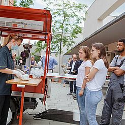 Anlaufstelle ist diefeuerrote "Kaffee-Ape“ die unter anderem mit Mitteln des Bonifatiuswerkes angeschafft werden konnte: ein dreirädriger Lieferwagen, ausgestattet mit einer Bar-Espressomaschine. Das Fahrzeug bringt ein wenig italienisches Flair nach Nürnberg-Gibiztenhof.