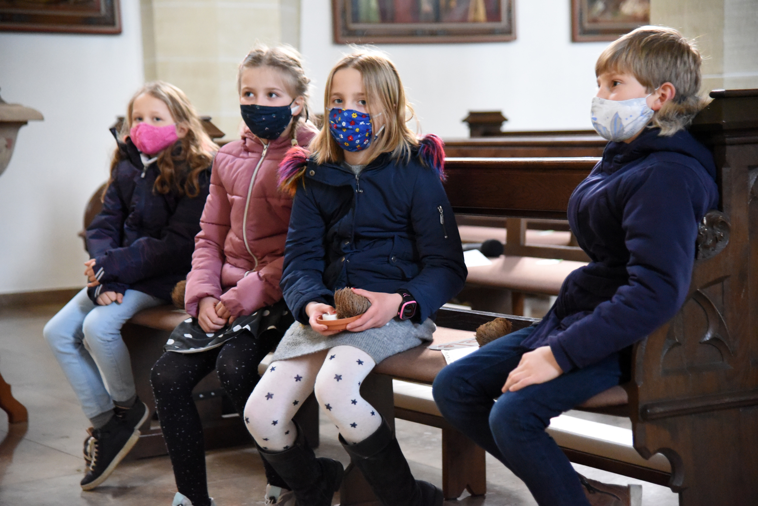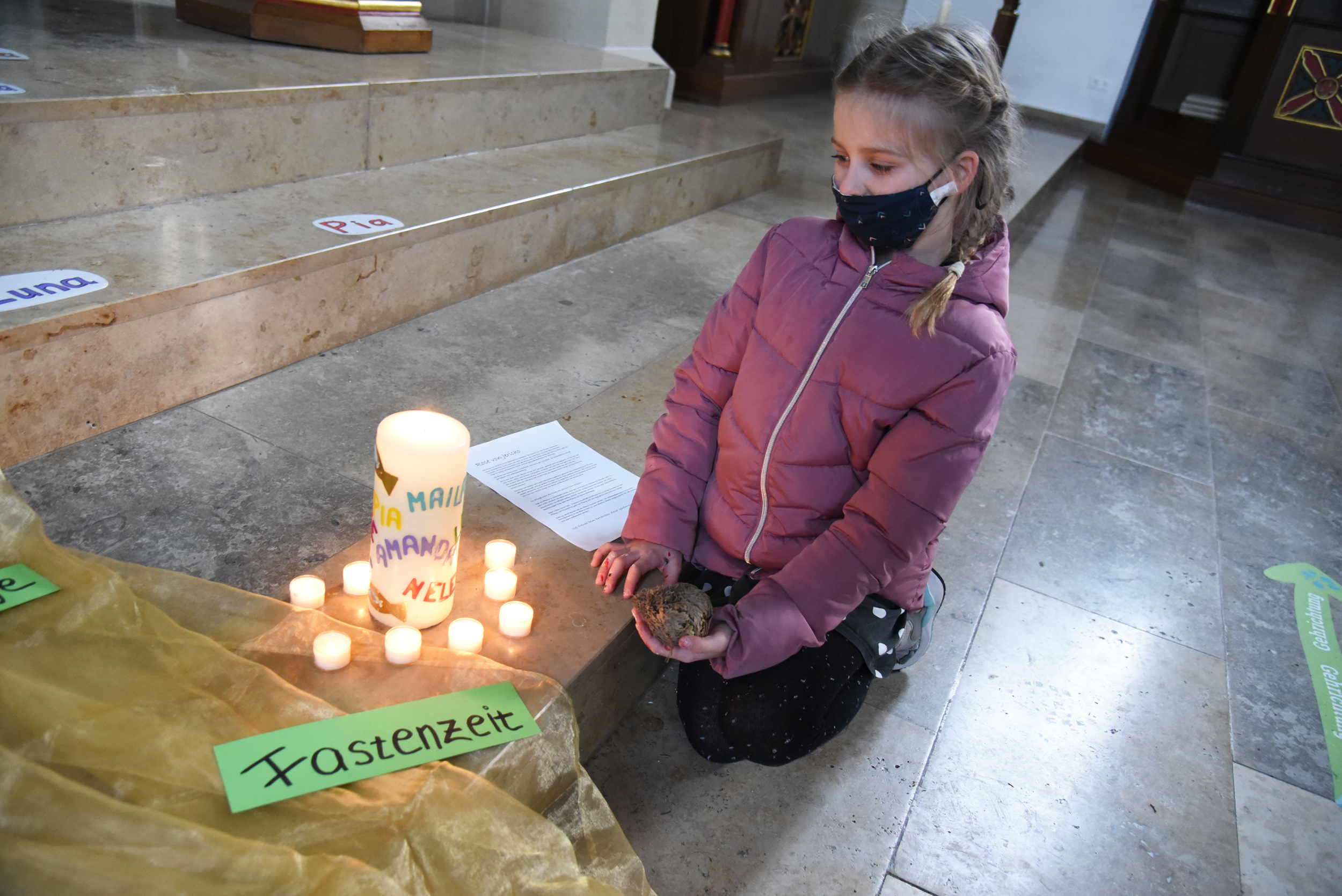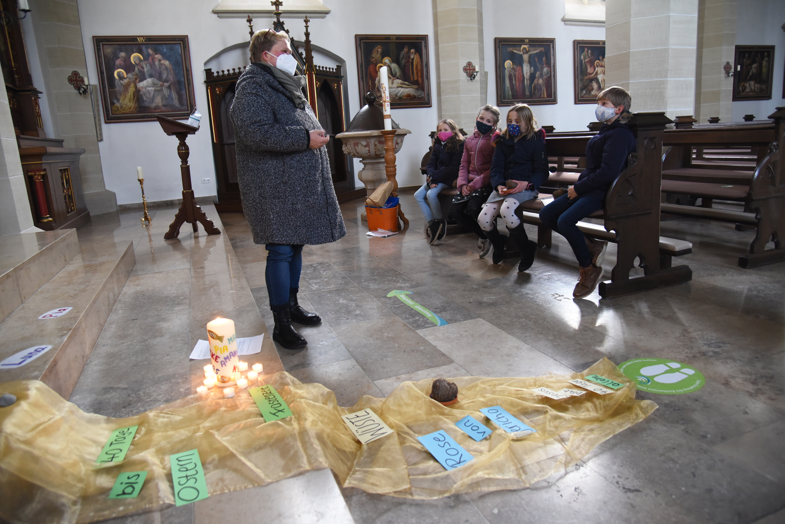 "Ich kann auf Corona verzichten" platzt es einem Mädchen heraus und alle anderen stimmen zu. "Drehen wir den Verzicht in diesem Jahr doch einmal um, und überlegen, was wir Gutes tun können", gibt das engagierte Gemeindemitglied den Kindern und einigen Eltern, die heute in die St. Margaretha Kirche gekommen sind, mit auf den Weg. Die gesammelten Ideen werden später auf einem Plakat zusammengetragen und in der Kirche ausgehängt, selbstgemalte Bilder werden an die Senioren in der Gemeinde verschenkt. Das besondere Gefühl von Gemeinschaft, das die Kinder bei ihrer Erstkommunion mit Gott und der Gemeinde erfahren, wird schon in der Vorbereitung direkt spürbar.