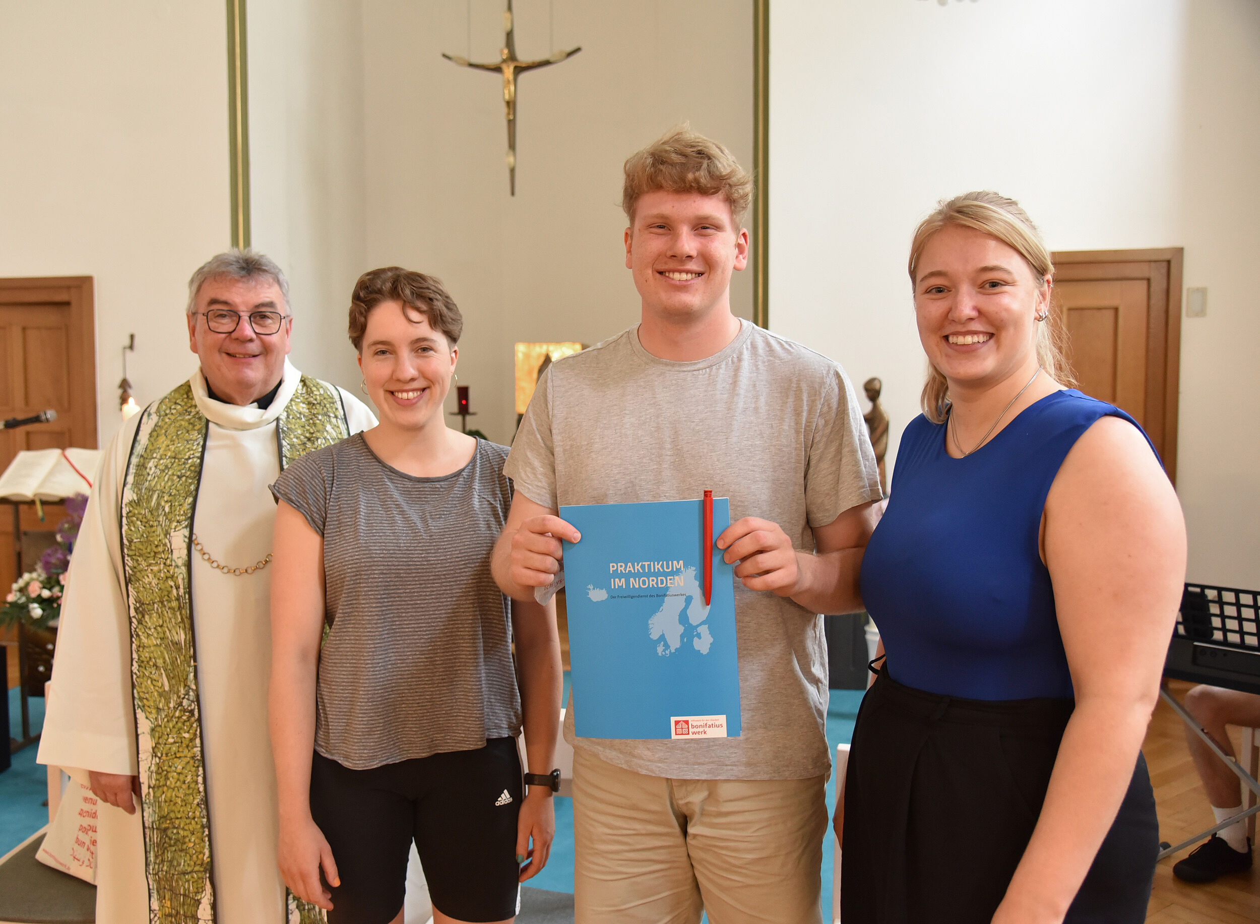 Zum Abschluss wurde gemeinsam Gottesdienst gefeiert, der von dem ehemaligen Bergen-Praktikant Raphael am Keyboard musikalisch begleitet wurde. Ebenfalls erhielten die Praktikantinnen und Praktikanten ein Abschlusszeugnis von Bonifatiuswerk-Referentin Marisa Grummich. Monsignore Georg Austen machte in seinem Impuls deutlich, dass die jungen Menschen jetzt nicht in ihre alte Routine verfallen, sondern die wertvollen Erfahrungen, genauso wie die Herausforderungen für sich annehmen sollten. "Seien Sie neugierig und offen und tragen Sie die Erlebnisse und Begegnungen in Ihrem Herzen als Inspiration für Ihren weiteren Lebensweg", so Austen.