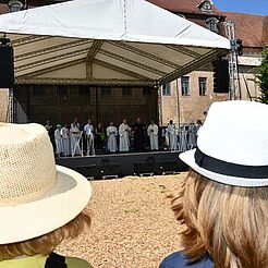 Die musikalische Gestaltung übernahm die Band Patchwork, die eigens aus Berlin angereist war, und sorgte - unterstützt von den Kinderchören der Gemeinden Leipzig-Engelsdorf und Leipzig-Gohlis - für beschwingte Stimmung auf dem Klostergelände. Nach einem Mittagspicknick mit selbst mitgebrachten Speisen konnten alle Wallfahrts-Teilnehmerinnen und -Teilnehmer unter einer Vielzahl an Workshops, Spiel- und Bastelangeboten auswählen. Auf dem Programm standen beispielsweise ein "Kinobesuch im Zelt" zum Thema Armut in Deutschland. Falkner und Schulseelsorger Leonhard Kindermann aus Leipzig erklärte mithilfe seines gefiederten Assistenten Wüstenbussard Winnetou, was ein Falkner mit Franz von Assisi gemeinsam hat. Erfrischende Temperaturen konnten alle Kinder bei einer spielerischen Entdeckungstour in der kühlen Wechselburger Basilika genießen. Weihrauchsorten konnten erschnüffelt werden. Bibelgeschichten wurden mit Figuren nachgespielt. Spiel, Spaß und Action kamen beispielsweise aber auch bei einem Zirkusworkshop, beim Werfen auf Blechdosen oder im vielbesuchten Bastelzelt nicht zu kurz. Mit einer Dankandacht endete am Nachmittag der Wallfahrtstag, ehe die Kindergruppen mit ihren Begleitern in zahlreichen Reisebussen wieder den Heimweg antraten. Neben allen Jungen und Mädchen, die in der ersten Ferienwoche die Religiöse Kinderwoche ihrer Gemeinden besuchen und so an der Wallfahrt teilnahmen, waren in diesem Jahr ausdrücklich auch besonders Familien zur Teilnahme eingeladen und nutzten dieses Angebot.