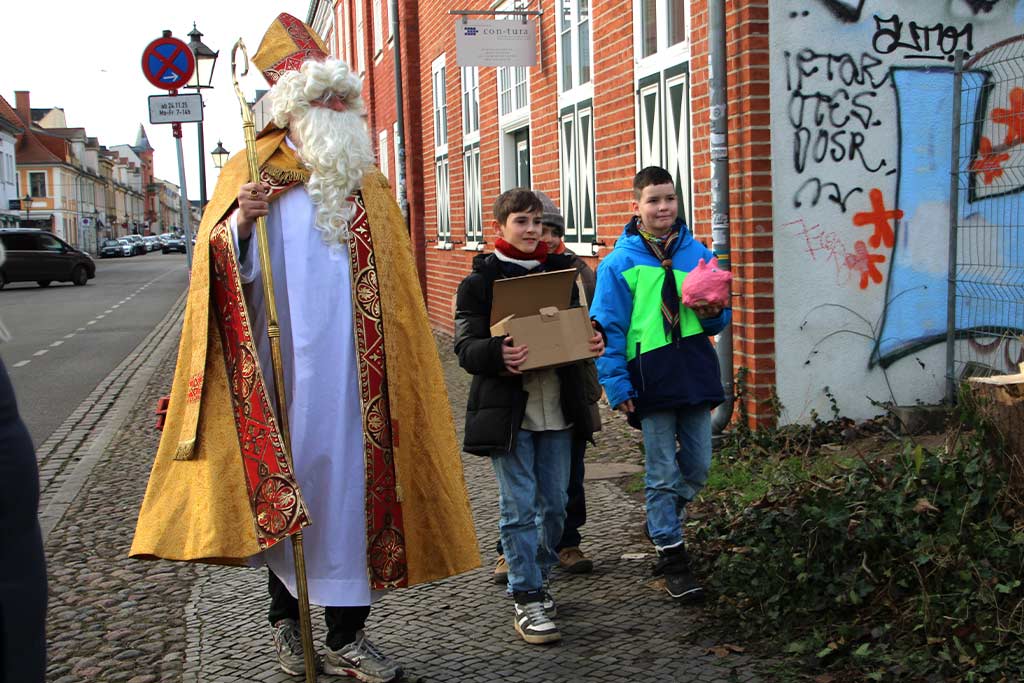 Da die Kirche mitten im Potsdamer Weihnachtsmarkt liegt, gab es noch eine weitere adventliche Überraschung: Der heilige Nikolaus selbst zog gemeinsam mit den Kindern der Gemeinde über den Markt und verschenkte Schokoladennikoläuse an andere Kinder. Auf die Frage “Was ist der Unterschied zwischen dem Weihnachtsmann und dem heiligen Nikolaus?” wussten viele, dass der Nikolaus Süßes bringt. Doch nur ein Kind kannte die eigentliche Botschaft: Der heilige Nikolaus war ein Bischof, der besonders den Armen half.