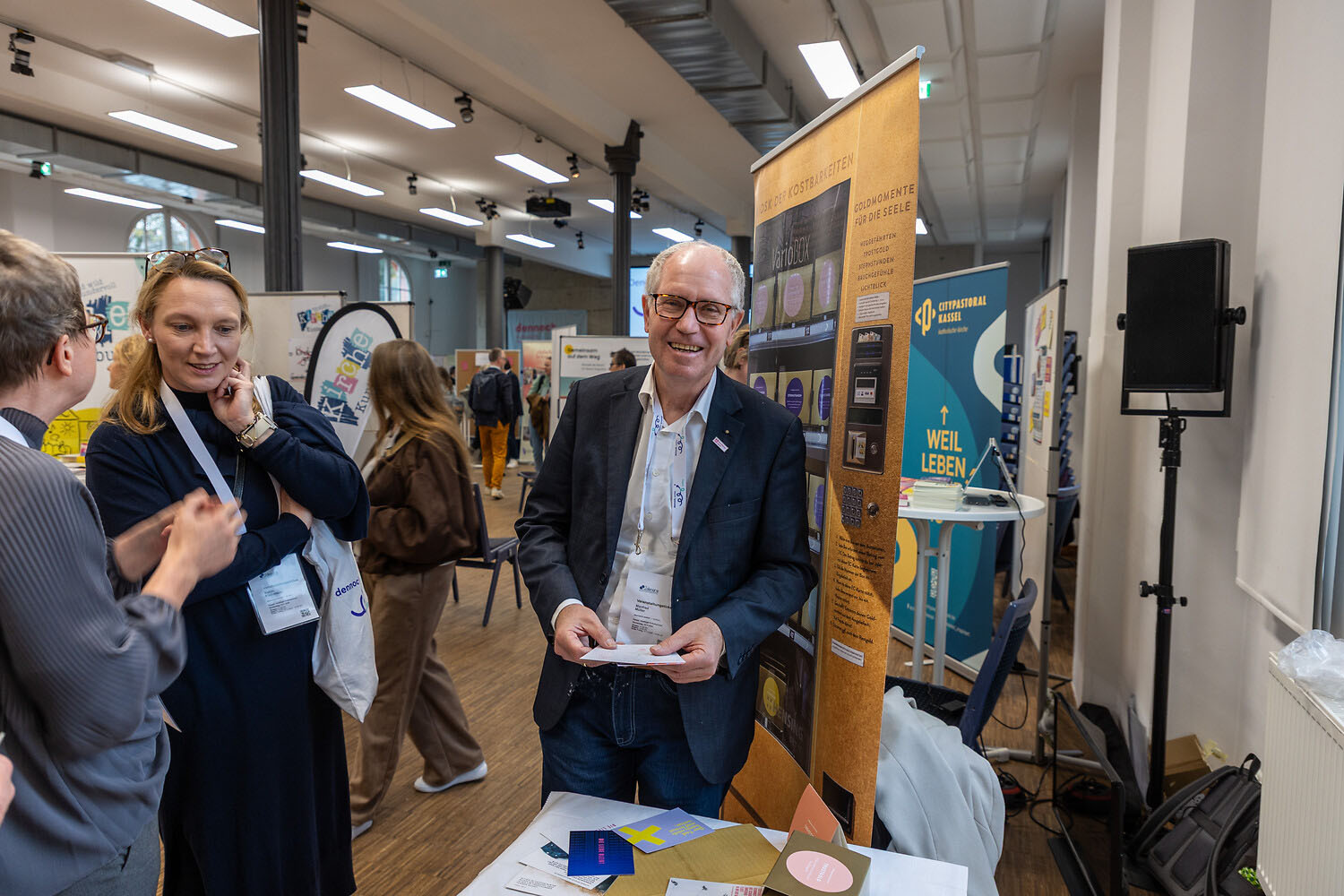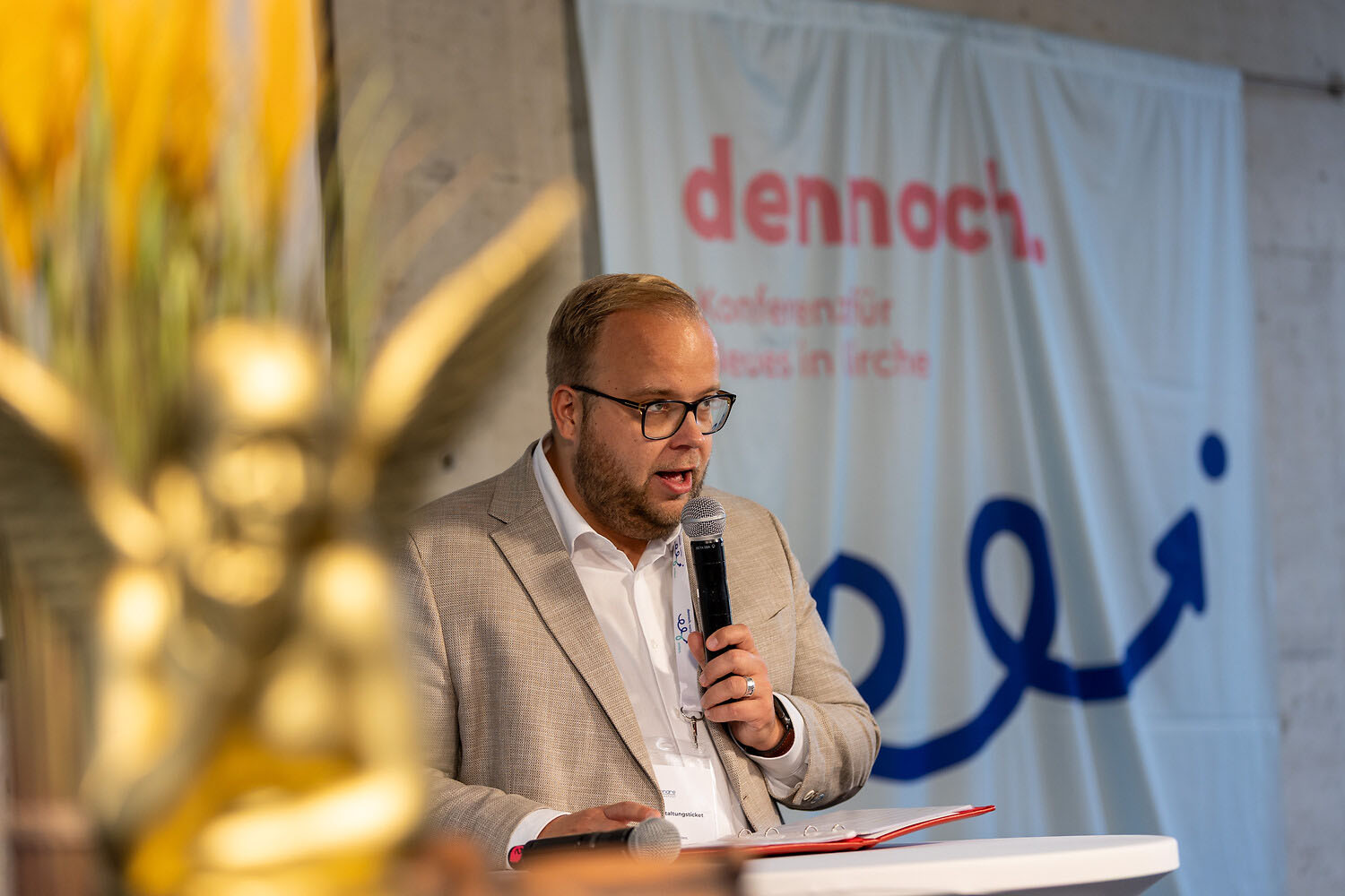 Das vom "2denare Beratungsinstitut" veranstaltete Event wurde vom Bonifatiuswerk der deutschen Katholiken, dem Zentrum für angewandte Pastoralforschung (zap), dem Evaluationsinstitut ɪmpækt und der philanthropischen Organisation Porticus unterstützt und gestaltet. "dennoch.weiter.anders" versteht sich als Fortentwicklung der dennoch-Konferenz 2023 in Hannover. Das Kasseler Format setzte anders als vor zwei Jahren mehr auf Messe-Charakter. Zahlreiche Info-Stände machten die Konferenz am Freitag zu einem Markt der Möglichkeiten, auf dem die teilnehmenden Initiativen ihr kreatives Potenzial zeigten.