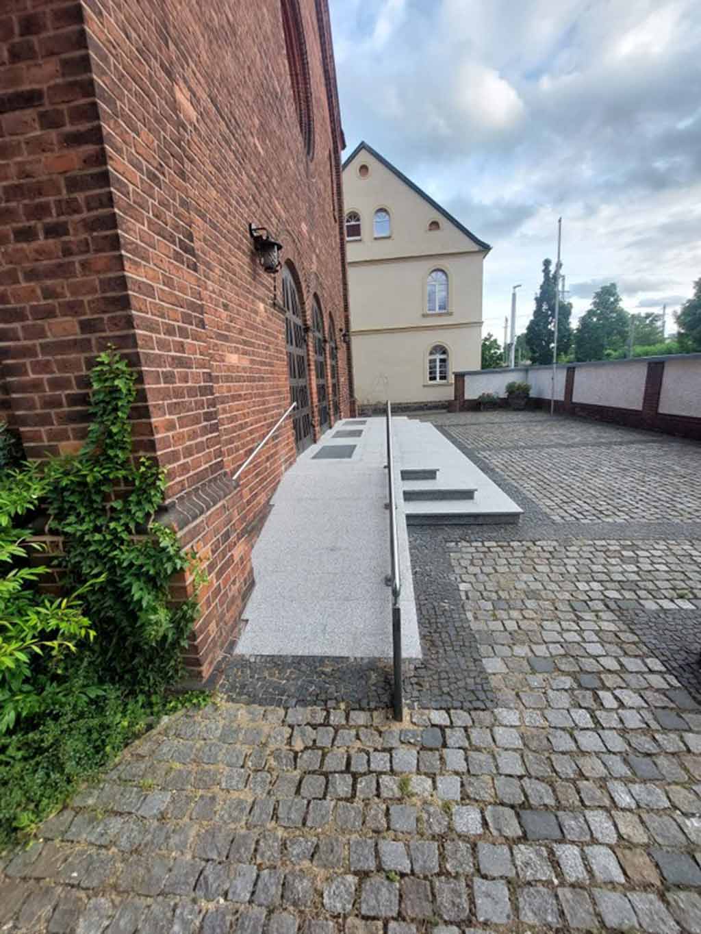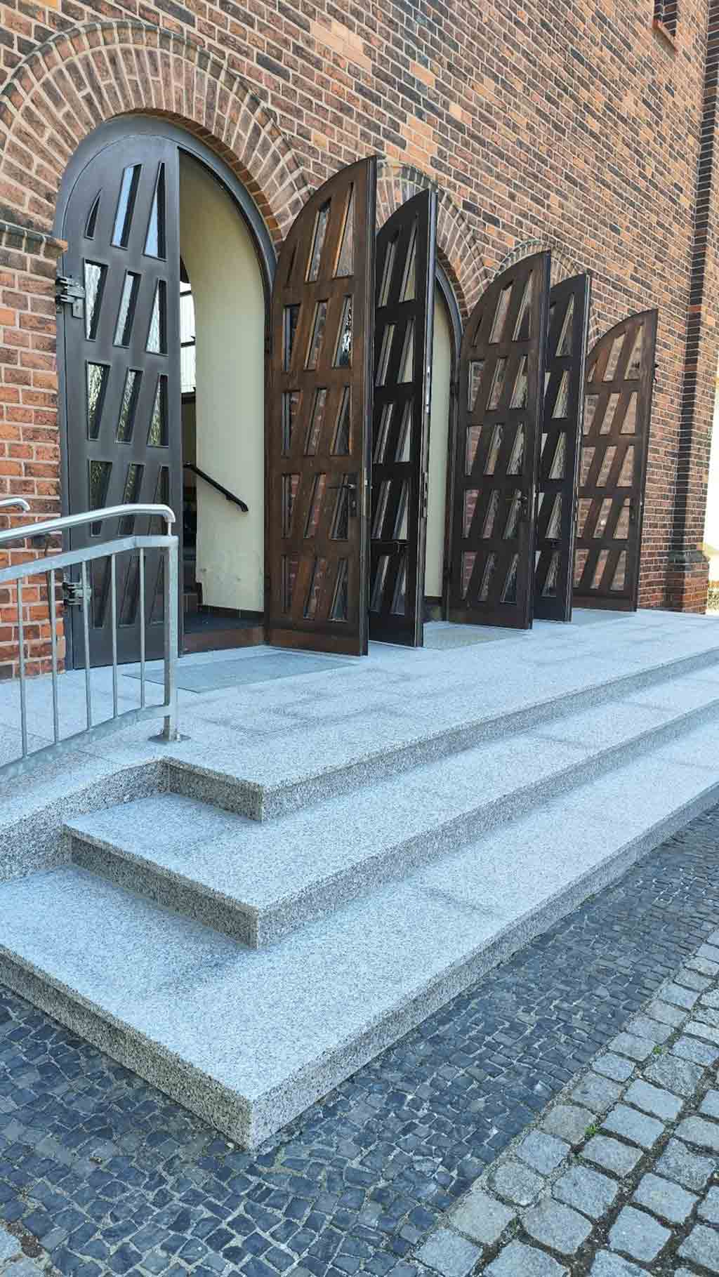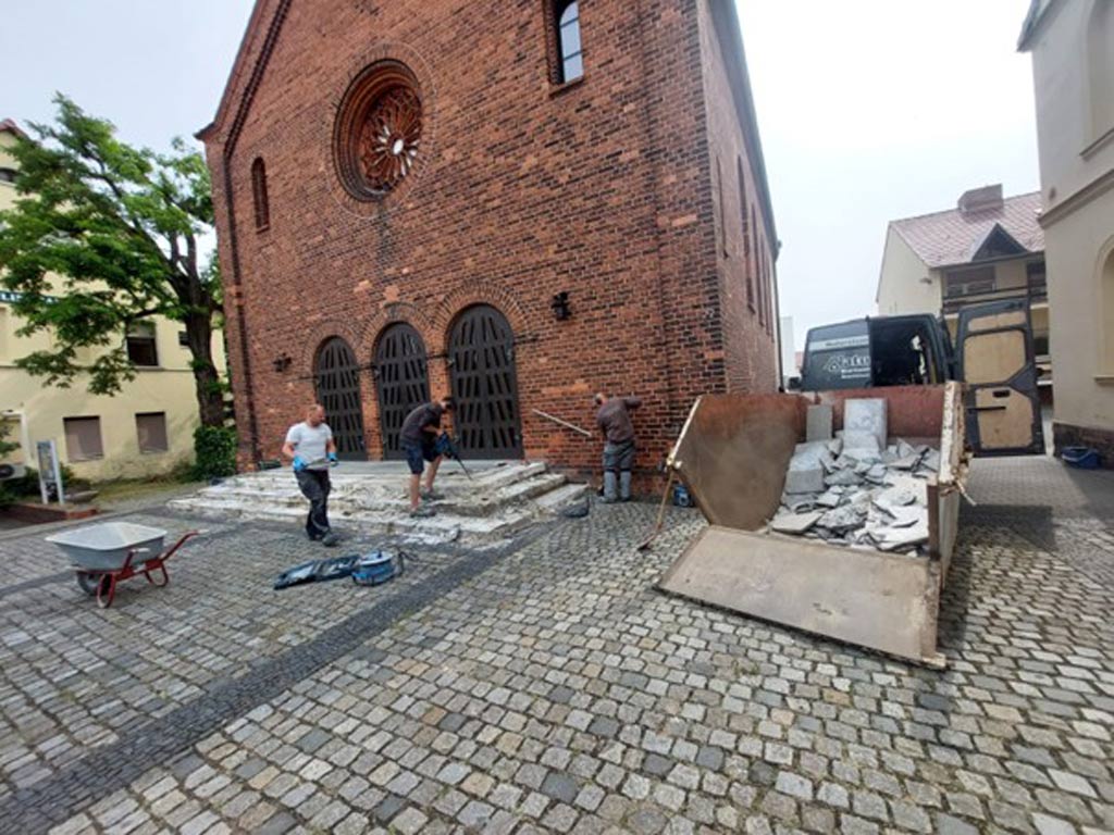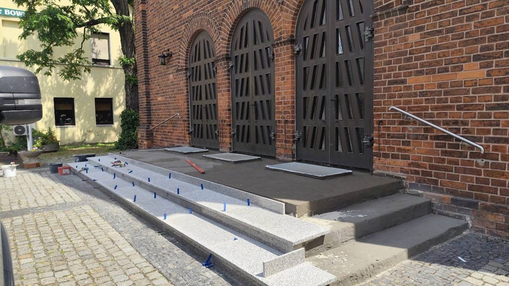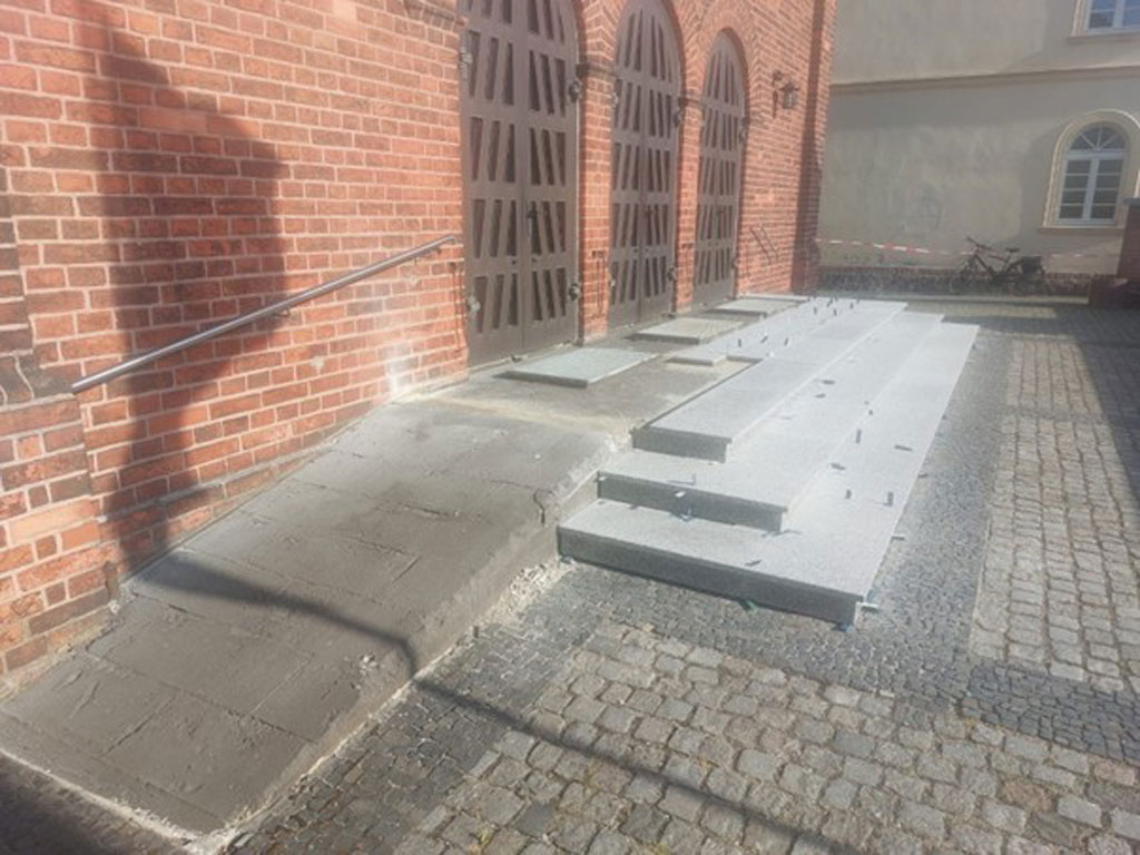 „Ich gehe zu Christus“ – mit diesen Worten betreten viele Gemeindemitglieder die Christuskirche in Cottbus. Doch der Weg dorthin war zuletzt nicht mehr gefahrlos: Nach Jahren intensiver Nutzung und Witterungseinflüssen hatten sich Teile des Granitplattenbelags an der Treppe vor dem Hauptportal gelöst oder waren abgebrochen. Für Gottesdienstbesucher, Gäste und die Kinder des benachbarten Caritas-Kindergartens St. Elisabeth, die die Kirche regelmäßig für Andachten nutzen, bestand akute Unfallgefahr.