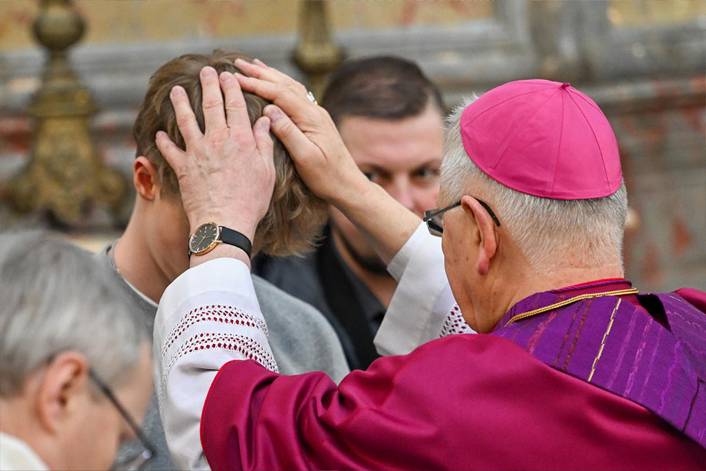 Heinrich Timmerevers, Bischof von Dresden-Meißen, verfolgte die persönlichen Zeugnisse aufmerksam. Nach einem gemeinsamen Mittagessen segnete er die Taufbewerberinnen und Taufbewerber im Rahmen einer Andacht in der Kathedrale einzeln und überreichte ihnen das Glaubensbekenntnis als Zeichen ihres bevorstehenden Weges in die Kirche.