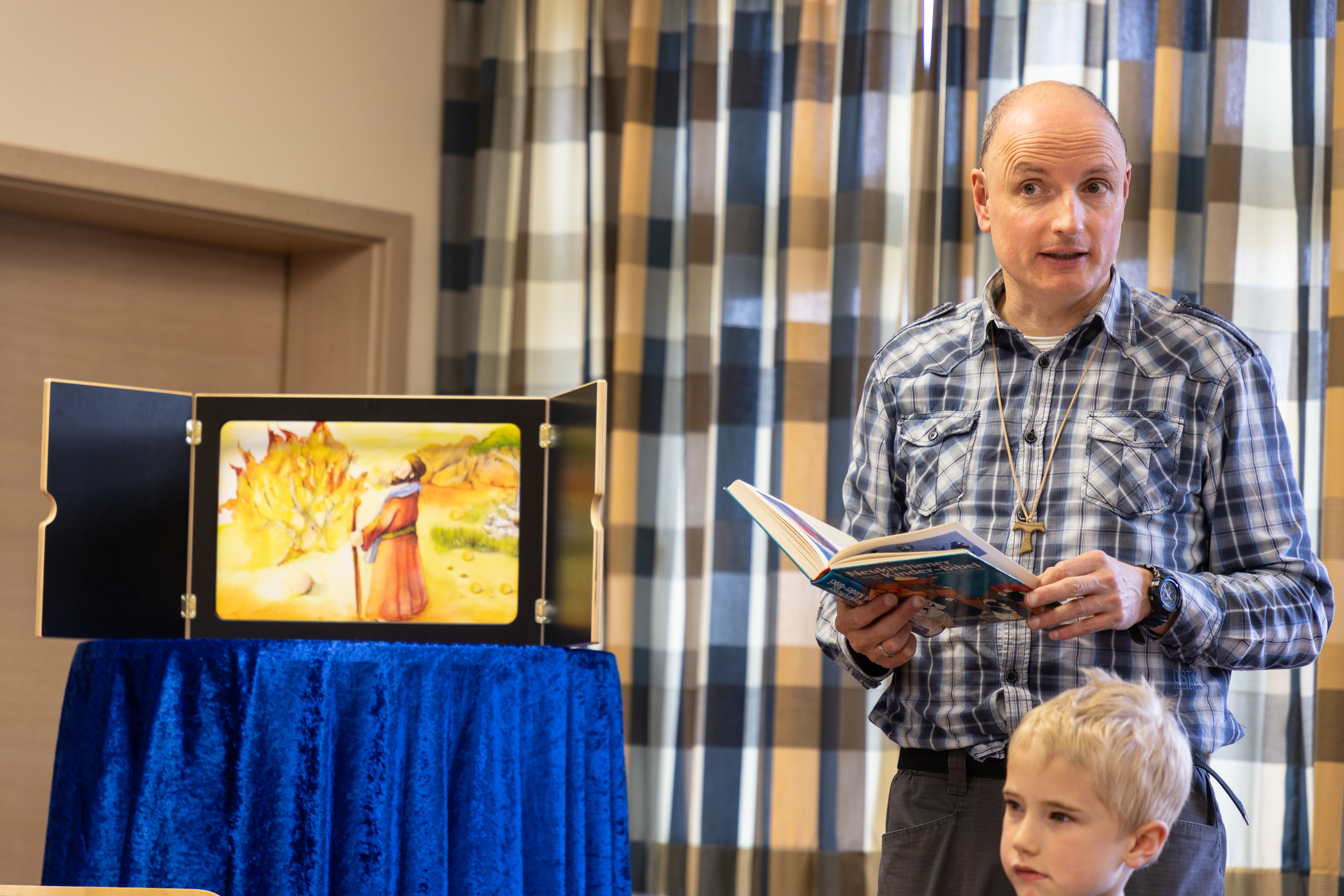 “Und Gott sprach zu Mose: ,Mose, heb’ deine Hand. Und das Meer wird sich teilen, solange du die Hand hebst‘”, liest Christof Stracke. Sein Arm beschreibt eine Bewegung durch die Luft . “Ihr werdet trockenen Fußes auf der anderen Seite ankommen.” Das Kamishibai hilft Christof Stracke dabei, die Geschichte greifbar zu machen. Bild für Bild zieht er die Bibelkarten aus dem Rahmen, jede Szene ein neuer Impuls. Das Prinzip ist einfach – und gerade deshalb so wirkungsvoll: sehen, hören, mitdenken.